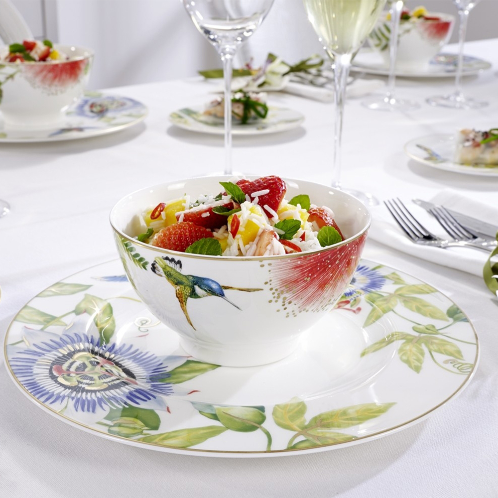 Imbogatiti-va colectia de vesela cu farmecul exotic al bolului AMAZONIA, disponibil la Nobila Casa, de la renumitul brand Villeroy&Boch. Acest bol delicat, cu un diametru de 11 cm, face parte din colectia AMAZONIA si aduce un strop de natura si rafinament in fiecare masa. Decorat cu o splendida pasare colibri, bolul AMAZONIA este realizat din portelan englezesc de cea mai inalta calitate, garantand durabilitate si un aspect elegant. Designul sau vibrant si detaliile minutioase ale pasarii colibri transforma acest bol intr-o piesa deosebita, perfecta pentru servirea micilor delicii, de la aperitive si deserturi, pana la sosuri si garnituri. Bolul AMAZONIA este un cadou minunat pentru iubitorii de frumos si natura, aducand un plus de culoare si rafinament in orice bucatarie sau sufragerie. Vizitati site-ul Nobila Casa pentru a descoperi bolul AMAZONIA de 11 cm si explorati intreaga colectie AMAZONIA de la Villeroy&Boch. Fiecare piesa din aceasta colectie reflecta aceeasi pasiune pentru detalii si design elegant, fiind ideala pentru a adauga un strop de exoticism si stil fiecarei mese.