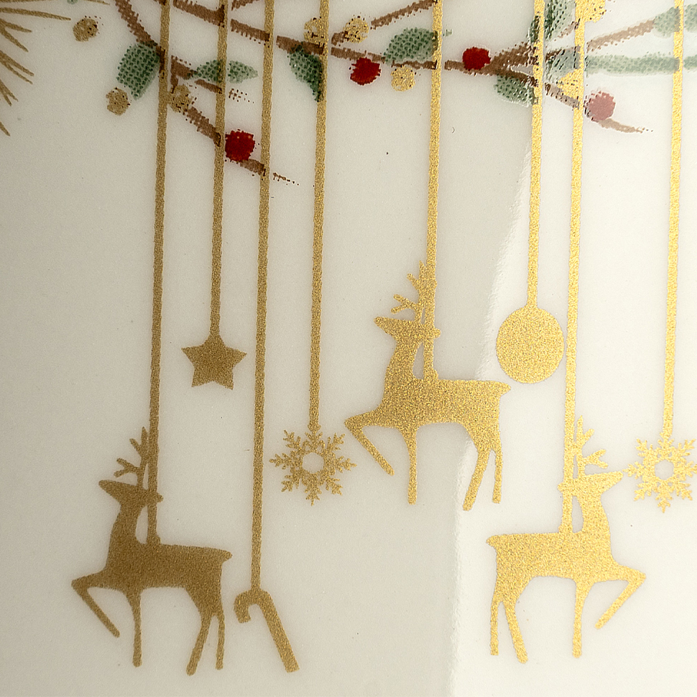 Savureaza bauturile calde preferate in sezonul rece cu cana GOLDEN ILEX, realizata din portelan, disponibila la Nobila Casa. Decorul festiv cu detalii aurii transforma fiecare ceai, cafea sau ciocolata calda intr-un moment de bucurie alaturi de familie. Este o piesa eleganta, perfecta pentru mesele de sarbatori sau pentru a fi oferita cadou celor dragi. Cana aduce magie si confort in fiecare zi de iarna. Alege si alte articole din colectia Golden Ilex pentru a crea un set complet si festiv.