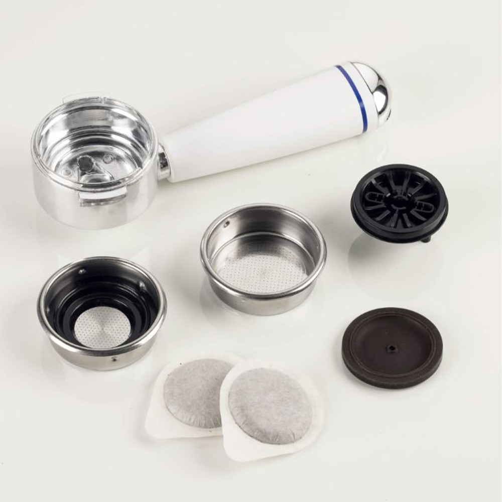 Instructiuni de folosire:Punerea in funcţiune Verificaţi daca tensiunea indicata pe placuţa cu date tehnice de sub aparat coincide cu cea din reţea. Aşezaţi aparatul pe o suprafaţa plana. Spalati rezervorul la prima utilizare si umpleti-l cu apa plata proaspata (MAX. 1 litru), avand apoi grija sa il introduceti bine in locasul sau (Fig. 3). Tubul de aspirare trebuie sa stea in rezervor. Prima pornire Dupa ce umpleti rezervorul cu apa plata proaspata, introduceti stecherul in priza electrica, care trebuie sa fie prevazuta cu impamantare. Puneti aparatul in functiune apasand butonul (J) (Fig. 1). Se va aprinde indicatorul luminos (R) care indica faptul ca aparatul este pornit. In cazul primei porniri sau dupa o perioada in care aparatul nu este folosit, este recomandat sa distribuiti cel putin o ceasca de apa din circuitul hidraulic al boilerului. 7 RO Asezati sub distribuitorul de cafea si sub dispozitivul Maxi Cappuccino un recipient cu o capacitate de cel putin jumatate de litru (Fig. 5). Aduceti intrerupatorul (Q) in pozitia pentru cafea ( ). Asteptati sa iasa apa din locasul de prindere a portfiltrului. Deschideti maneta de distribuire a aburului (M) si lasati sa iasa apa din dispozitivul Maxi Cappuccino. Terminati prepararea readucand intrerupatorul (Q) in pozitia de sus. Inchideti maneta de distribuire a aburului. Asteptati ca indicatorul luminos (N) sa se aprinda. Aparatul este acum pregatit pentru a prepara cafea. MODUL DE PREPARARE A CAFELEI Cu cafea macinata Introduceti picuratorul (B), discul perforat din silicon (C) si filtrul pentru 2 cesti (E) sau 1 ceasca (D) in portfiltrul (A) (Fig. 6). Discul perforat din silicon poate fi introdus pe picurator doar intr-un singur sens. Dozati cafeaua in filtru si presati usor cu presa speciala: doua masuri pentru doua ceşti şi o masura pentru o ceaşca. Fixati portfiltrul in locasul corespunzator. Strangeţi-l bine rotindu-l de la stanga la dreapta şi asiguraţi-va ca este prins bine de flanşa (Fig. 8). Daca se introduce o cantitate excesiva de cafea macinata in filtru, poate fi dificila strangerea completa a portfiltrului in locasul sau si/sau pot aparea scurgeri din portfiltru in timpul prepararii cafelei. Este recomandat sa lasati portfiltrul sa se incalzeasca, introdus in locasul sau, timp de cateva minute, pentru a obtine o prima cafea fierbinte. Acest lucru nu va fi necesar pentru urmatoarele ceşti de cafea. Asteptati ca indicatorul luminos (N) sa se aprinda. Pozitionati intrerupatorul (Q) in pozitia pentru cafea ( ): cafeaua va incepe sa curga din orificiile portfiltrului. Terminati prepararea readucand intrerupatorul (Q) in pozitia de sus. Doza minima pentru o cafea este de 50 ml. Atenţie! La fel ca in cazul aparatelor de cafea profesionale, nu scoateti portfiltrul atunci cand intrerupatorul de preparare este activat (in pozitia pentru cafea ). Atenţie! Dupa ce cafeaua a terminat sa curga, aşteptaţi aproximativ 10 secunde inainte de a decupla portfiltrul. Pentru a scoate portfiltrul, rotiti-l incet de la dreapta la stanga, pentru a evita stropii de apa sau cafea. Daca ies mici jeturi de abur din locasul de prindere a portfiltrului, fenomenul este complet normal. Indicatorul luminos (N) se va stinge si aprinde periodic, indicand interventia termostatului boilerului, care ajuta la mentinerea unei temperaturi optime a apei (aproximativ 100 °C / 210 °F pentru prepararea cafelei si aproximativ 150 °C / 300 °F pentru distribuirea aburului). Este recomandat, atat pentru prima cafea, cat si pentru cafelele urmatoare, sa se porneasca prepararea cafelei numai dupa ce se aprinde indicatorul luminos (N). 8 RO Prepararea cafelei cu capsule Pentru a prepara cafea cu o capsula, trebuie sa folositi filtrul special 1 ceasca/capsula (D) din dotare, in modul urmator: 1 Pozitionati capsula in portfiltru (Fig. 17). 2 Impingeti capsula cu degetele in interior. Capsula trebuie sa fie bine centrata si asezata in portfiltru. 3 Acum se poate introduce portfiltrul in locasul sau. Strangeti portfiltrul, asigurandu-va ca l-ati fixat bine pe flansa (Fig. 8). 4 Dupa prepararea cafelei, la scoaterea portfiltrului, capsula ar putea ramane blocata in partea superioara a aparatului. Pentru a o scoate, inclinati portfiltrul (Fig. 18), lasand capsula sa cada pe acesta. Pentru a prepara mereu o cafea optima, trebuie sa achizitionati capsule inscriptionate cu marcajul de compatibilitate E.S.E In cazul in care capsula nu este bine introdusa sau portfiltrul nu este bine strans, ar putea iesi cateva picaturi de apa din portfiltru. Functie de autostingere Daca aparatul este pornit, dar nu este folosit, dupa aproximativ 30 de minute, intervine functia de autostingere. Aceasta functie plaseaza aparatul in modul standby. Indicatorul luminos de pornire (R) este stins. Pentru a porni din nou aparatul, apasati din nou butonul de pornire (J). Umplerea rezervorului de apa in timpul utilizarii Nu este necesara nicio operatie deosebita cand se termina apa din rezervor, deoarece aparatul are o supapa speciala de autodeclansare. Dupa ce scoateti stecherul din priza, va fi suficient sa extrageti rezervorul si sa il umpleti din nou. MODUL DE PREPARARE A UNUI CAPPUCCINO Pentru a prepara un cappuccino, ciocolata calda sau pentru a incalzi orice alta bautura, aduceti intrerupatorul (O) in pozitia pentru abur si asteptati sa se aprinda indicatorul luminos (N), care indica faptul ca boilerul a ajuns la temperatura potrivita pentru a distribui abur (aproximativ 150 °C / 300 °F). Daca ies mici jeturi de abur din locasul de prindere a portfiltrului, fenomenul este complet normal. Asezati un pahar sub dispozitivul Maxi Cappuccino (H). Rotiti maneta de distribuire a aburului (M): mai intai, va iesi putina apa si imediata dupa aceea, un jet puternic de abur. Inchideti maneta de distribuire (M) pentru a intrerupe jetul de abur si asezati sub dispozitivul Maxi Cappuccino ibricul cu laptele de spumat (Fig. 12). Scufundati duza in ibricul de lapte si deschideti din nou maneta de 