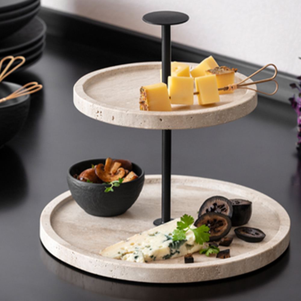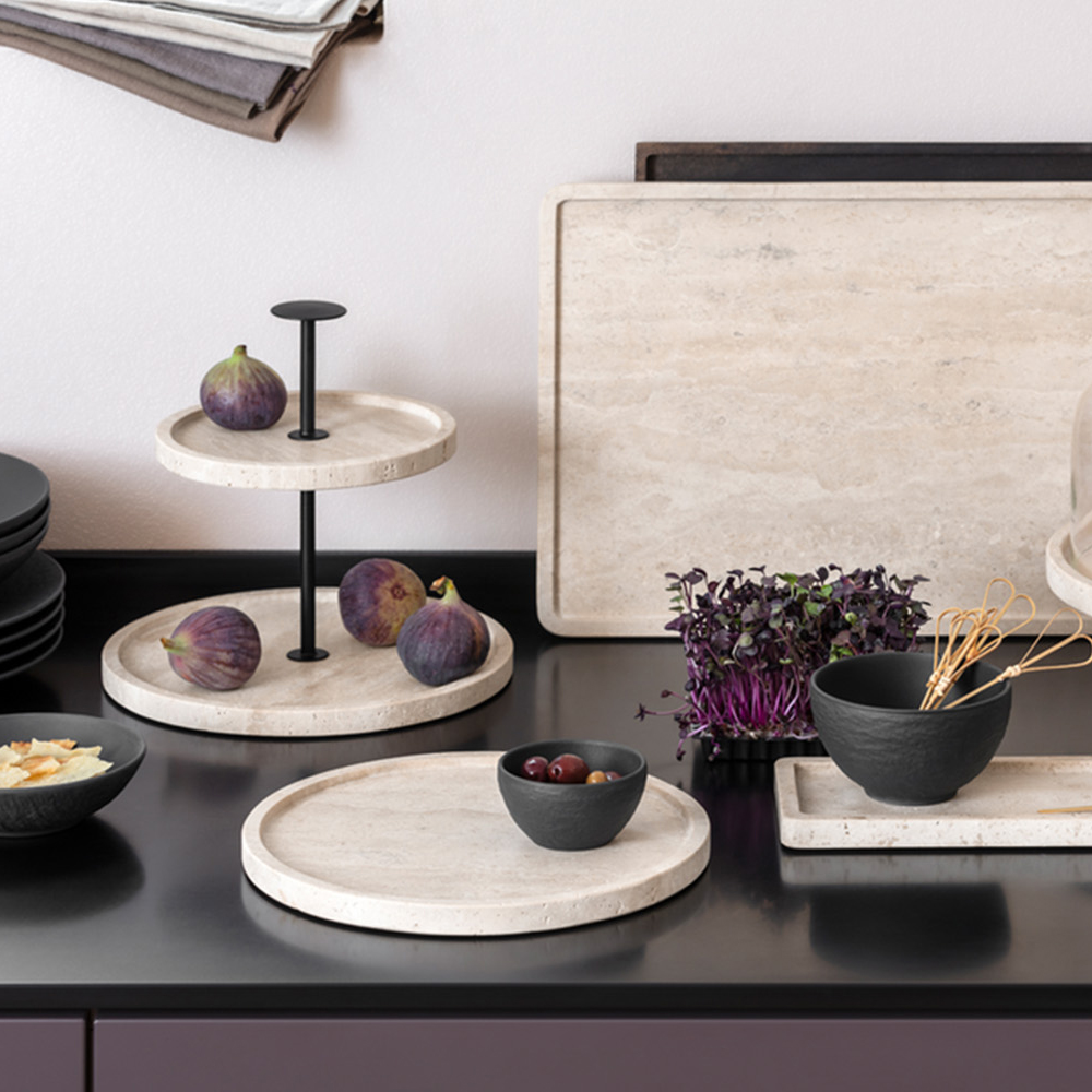 Platoul cu 2 nivele face parte din colectia Manufacture Travertine, care pune in valoare frumusetea pura a materialelor naturale. Se poate combina perfect cu piesele din colectia Manufacture Rock, pentru un contrast sofisticat intre textura de piatra si finisajele ceramice. Alege acest platou pentru a transforma fiecare masa intr-o experienta estetica si culinara aparte.