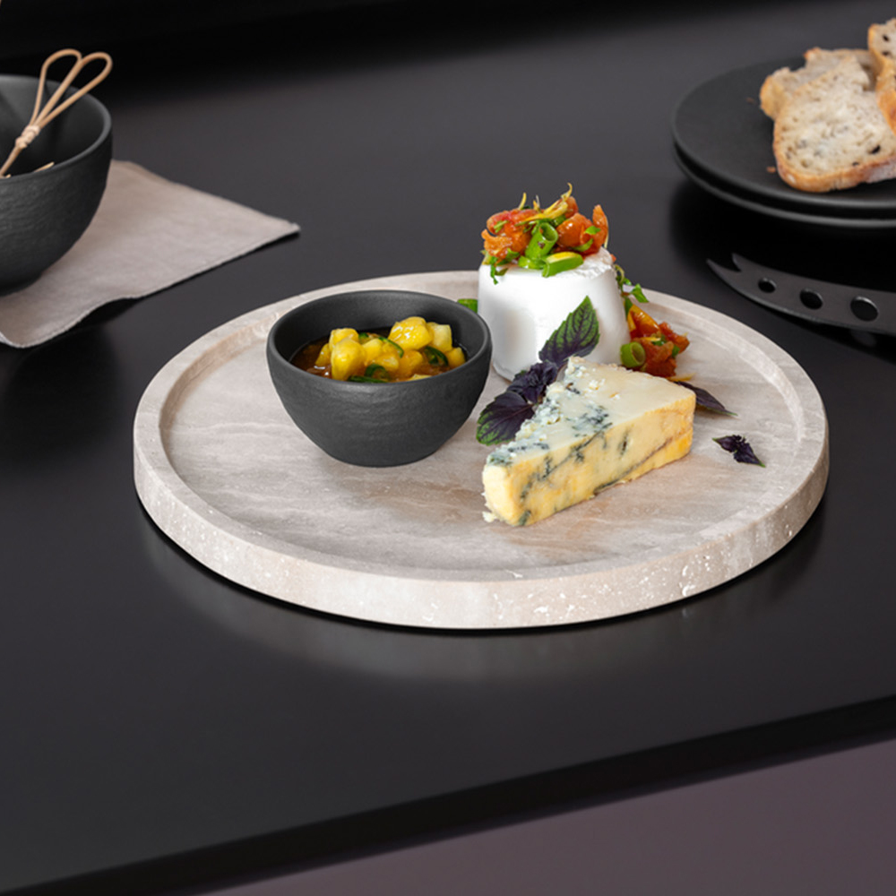 Platoul rotund pentru servire Manufacture Travertine, cu diametrul de 24,5 cm, realizat din travertina naturala, este o piesa rafinata si expresiva din gama premium Villeroy & Boch. Cu un design minimalist si o textura autentica de piatra, acest platou aduce o nota eleganta si naturala in orice aranjament de masa. Este ideal pentru servirea branzeturilor fine, a deserturilor, a gustarilor sau chiar ca suport decorativ pentru lumanari si obiecte mici de decor.