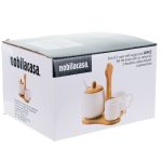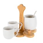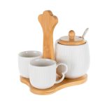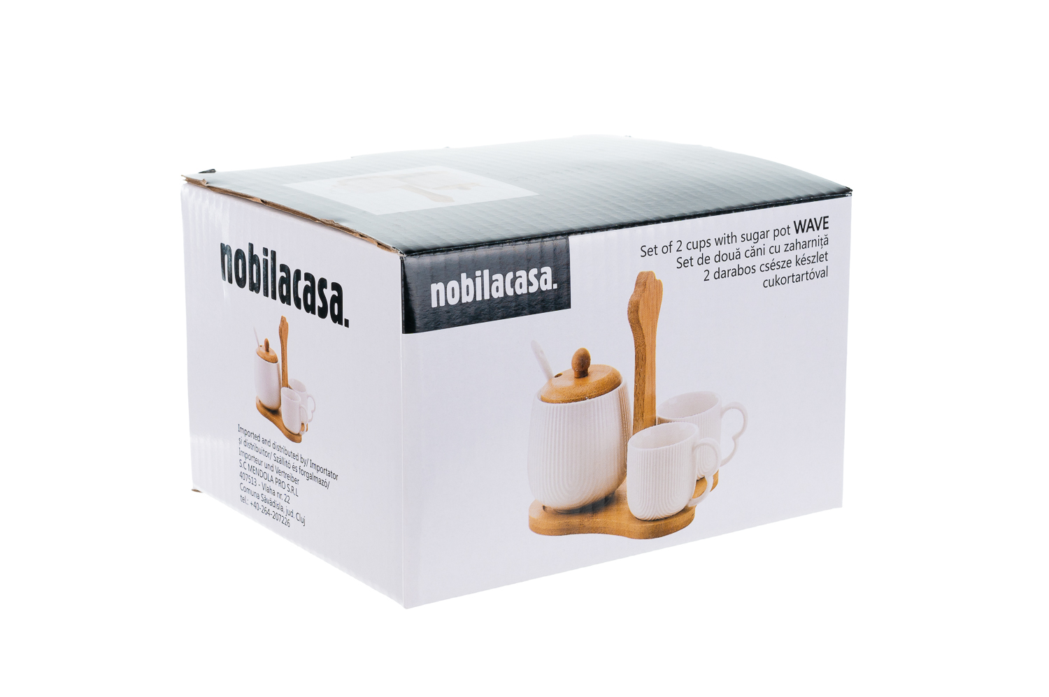 Adaugati un strop de rafinament momentelor de rasfat cu setul de doua cani cu zaharnita Wave de la Nobila Casa, parte din colectia Wave. Realizat din portelan alb de inalta calitate, acest set este perfect pentru a savura cafeaua sau ceaiul alaturi de prieteni sau familie. Designul sau elegant si modern aduce un plus de stil oricarei bucatarii, fiind completat de suportul din bambus pentru o prezentare si organizare impecabile. Caracteristicile cheie includ materialul din portelan alb de calitate superioara, durabil si estetic placut, setul complet format din doua cani si o zaharnita, ideale pentru momentele de relaxare, si suportul din bambus, care adauga un element natural si elegant setului. Avantajele acestui set includ transformarea fiecarei pauze de cafea sau ceai intr-o experienta speciala de rasfat, potrivirea perfecta pentru a fi oferit ca un cadou rafinat si practic celor dragi, si usurinta de intretinere a portelanului de calitate, care este usor de curatat si mentine un aspect impecabil. Setul de doua cani cu zaharnita Wave de la Nobila Casa este alegerea ideala pentru a transforma momentele de relaxare intr-un adevarat rasfat. Descoperiti si alte produse din colectia Wave pentru a completa setul si a aduce un plus de eleganta in fiecare zi.