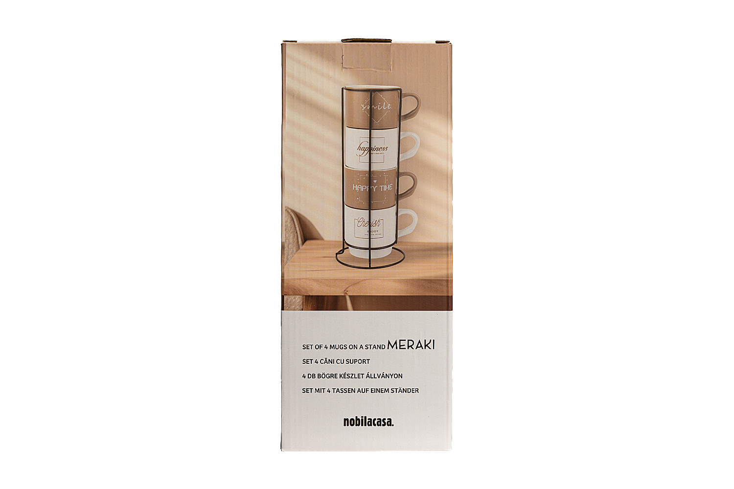 Setul de 4 cani pe suport MERAKI de la Nobila Casa, parte din colectia Meraki, este alegerea ideala pentru orice bucatarie. Fiecare cana este realizata din portelan de calitate, avand o capacitate de 280 ml, perfecta pentru a savura ceaiul sau cafeaua preferata. Canile au un design modern in culori alb-bej, adaugand un plus de rafinament momentelor de relaxare.Suportul din metal inclus in set ofera un mod practic de a organiza canile si contribuie la aspectul estetic al bucatariei tale. Cu acest set, vei avea intotdeauna canile la indemana, intr-un mod ordonat si placut vizual. Setul MERAKI este si o idee excelenta de cadou. Fie ca vrei sa il oferi cuiva drag sau sa iti faci tie un mic rasfat, aceste cani aduc un plus de eleganta si confort in orice moment al zilei. Alege setul MERAKI pentru a transforma fiecare pauza de ceai sau cafea intr-un moment special de relaxare si bucurie.