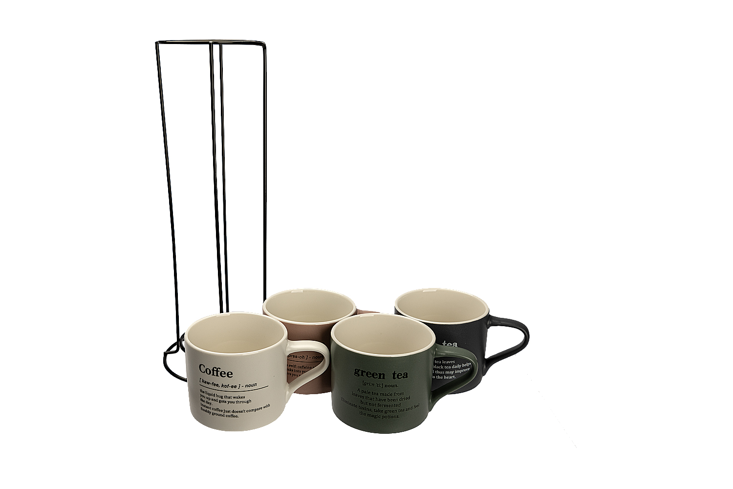 Setul de 4 cesti BREKKY de la Nobila Casa este alegerea perfecta pentru a aduce un plus de stil si functionalitate in bucataria ta. Realizate din portelan de inalta calitate, cestile au o capacitate de 250 ml, fiind ideale pentru a savura cafeaua sau ceaiul preferat in fiecare dimineata. Designul modern si minimalist este accentuat de culorile elegante %u2013 alb, verde, soft pink si negru, adaugand un aer sofisticat si contemporan oricarui spatiu. Fiecare ceasca este decorata cu inscriptii minimaliste inspirate din dictionar, precum „coffee”, „espresso”, „black tea” si „green tea”, oferind un detaliu subtil si elegant pentru iubitorii de bauturi calde. Setul vine insotit de un suport functional din metal negru, care permite organizarea estetica si practica a cestilor, economisind spatiu si oferind un plus de eleganta bucatariei tale. Pentru un plus de confort, cestile se pot folosi in cuptorul cu microunde si se pot spala in masina de spalat vase, fiind usor de intretinut si perfecte pentru uz zilnic. Acest set nu este doar un accesoriu practic, ci si o idee excelenta de cadou pentru iubitorii de cafea si ceai, aducand un plus de modernitate si rafinament in orice bucatarie. Alege setul BREKKY pentru a transforma fiecare moment de relaxare intr-o experienta placuta si stilata!