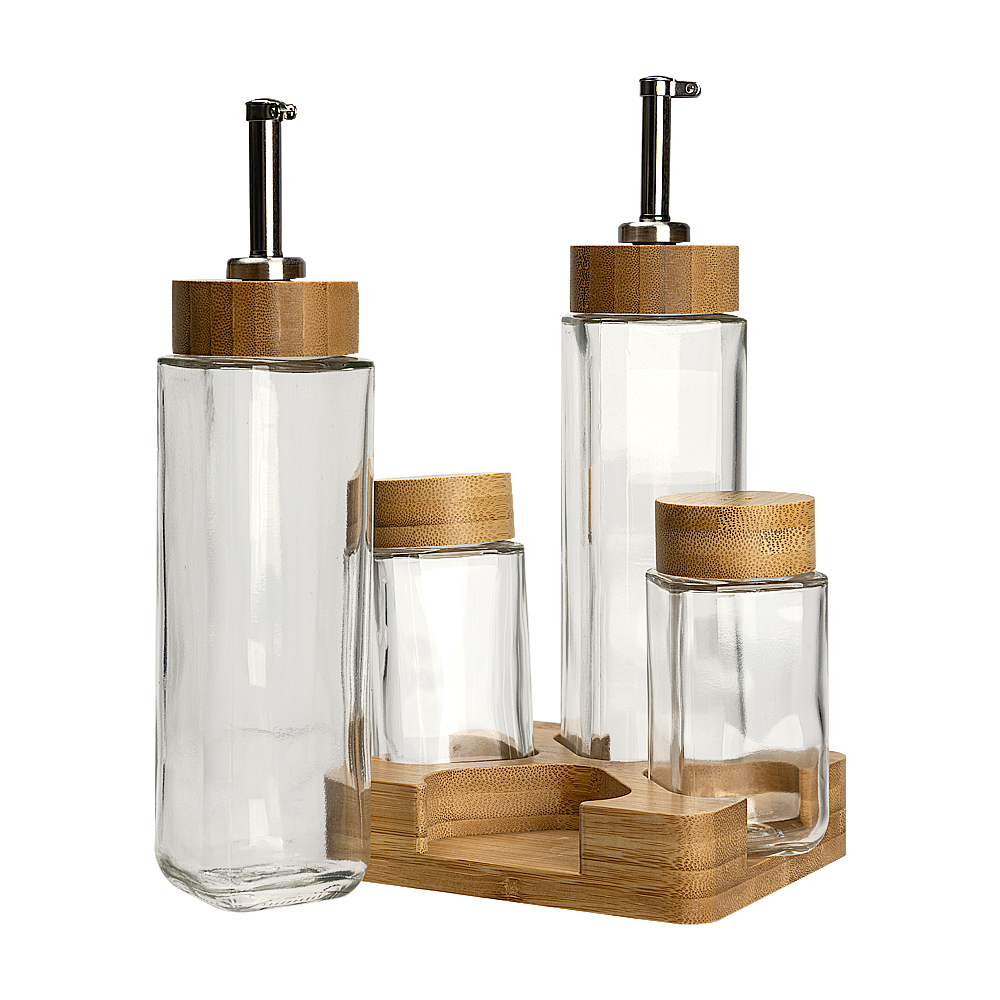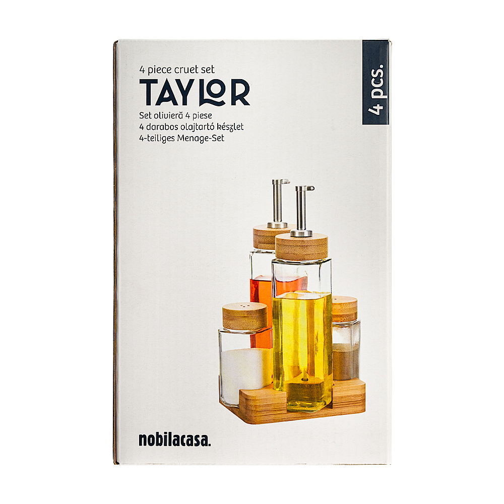 Setul oliviera 4 piese din colectia Taylor de la Nobila Casa este solutia ideala pentru organizarea condimentelor esentiale pe masa sau in bucatarie. Cu un design modern si armonios, acest set contine un recipient pentru ulei, unul pentru otet, o pipernita si o solnita, toate realizate din sticla transparenta si completate cu detalii din bambus natural. Materialele alese ofera durabilitate, igiena si usurinta in utilizare, in timp ce aspectul elegant transforma setul intr-un accesoriu decorativ perfect pentru mesele zilnice sau festive. Colectia Taylor este apreciata pentru functionalitatea si estetica sa, fiind perfecta pentru cei care doresc sa combine utilul cu frumosul. Setul este potrivit si ca idee de cadou pentru casa noua sau pentru persoanele pasionate de aranjamente de masa rafinate. Descopera toate produsele colectiei Taylor in magazinele Nobila Casa sau pe nobilacasa.ro si adauga un plus de stil bucatariei tale.